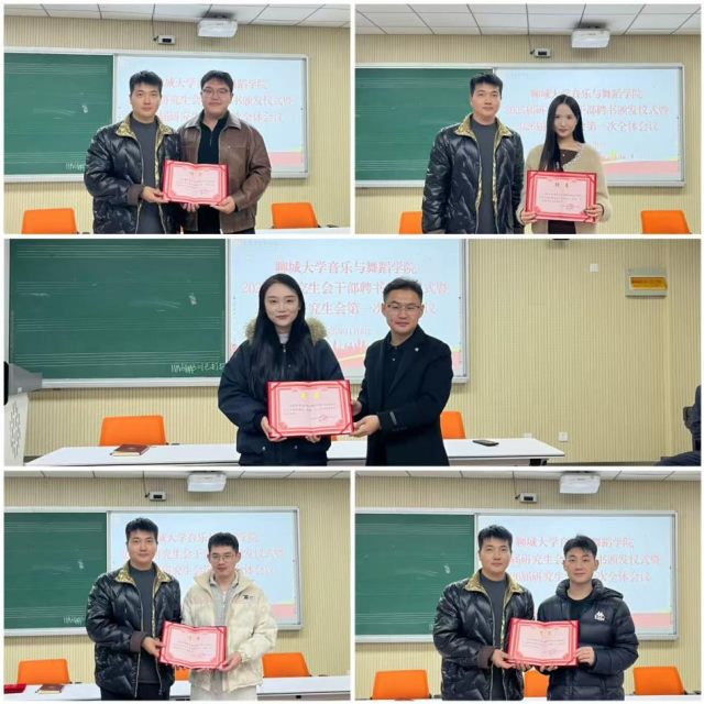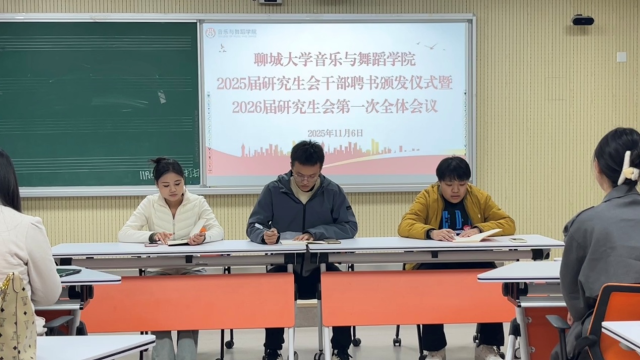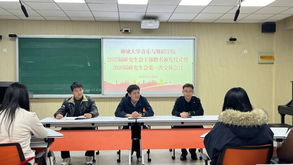 为推动研究生会高效协同运作,明确工作准则、强化责任担当,11月6日晚,音乐与舞蹈学院2025届研究生会干部聘书颁发仪式暨2026届研究生会第一次全体会议在9号楼301教室顺利召开。辅导员孙旭、25级研究生班主任屈怀凯、科研秘书张家会及研究生会全体成员参加会议。