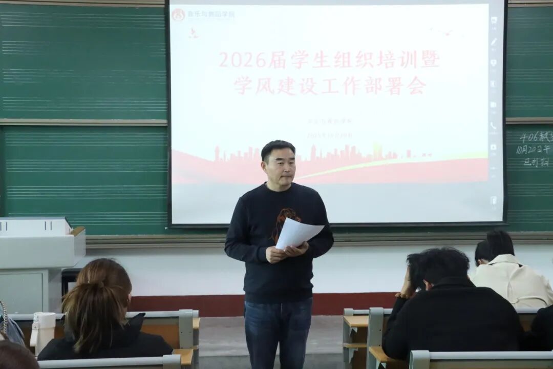 学院党委副书记蘧广震参加学风建设月活动启动仪式,部署相关活动,强调要以此次学风建设月活动,将“崇乐、尚雅、明德、至善”的音舞精神内化为全体学生的共同信念和行动自觉,构筑优良育人生态。通过统一思想、凝聚共识,强化了学生骨干队伍的思想认同感与使命担当精神,使其深刻认识到自身在学风建设中的引领示范责任。