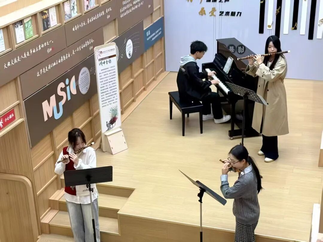学院倾力打造集音乐欣赏、艺术实践、文化传播功能于一体的“湖畔音韵”特色文化驿站,为学生搭建了展示专业技艺的舞台,构建“专业学生实践-普通学生受益”双向美育机制,打造了“音乐+”跨学科融合创新空间。