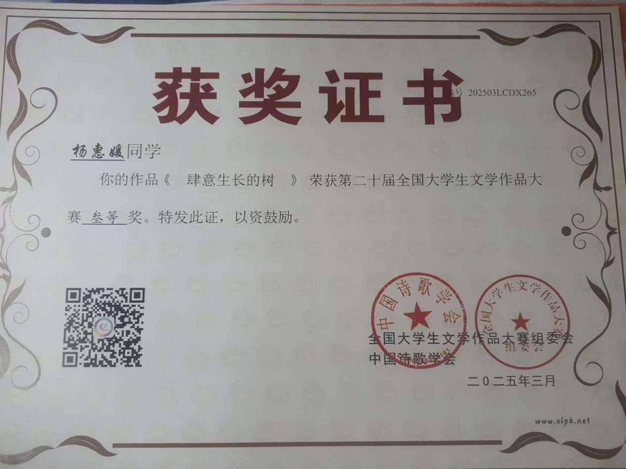 音乐与舞蹈学院家庭经济困难学生杨惠媛在在二十届全国大学生文学作品大赛中荣获三等奖,这一成绩的取得,不仅展现了她在文学创作方面的才华与努力,更为学院争得了荣誉。尽管家庭经济困难,但杨惠媛始终保持着积极向上的心态,勤奋学习,不断提升自己的文学素养和创作能力。