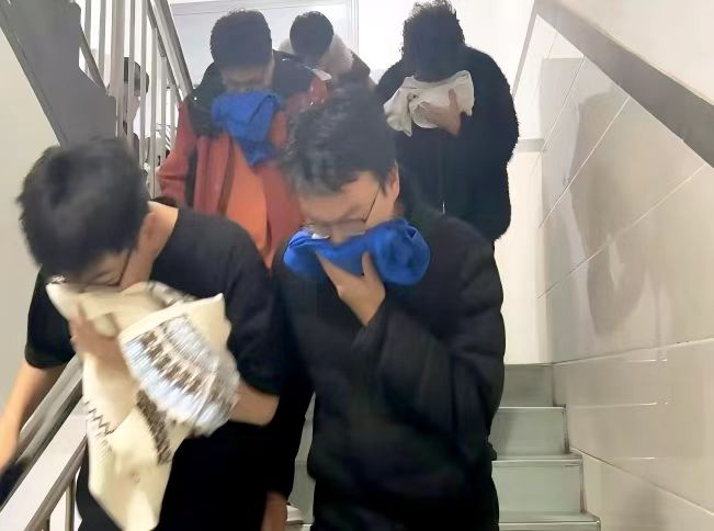 随着模拟火灾警报信号急促响起,演练正式拉开帷幕。各宿舍长迅速响应,组织本宿舍同学进入紧急疏散状态。同学们严格遵循消防逃生规范,以湿毛巾、衣物紧密捂住口鼻,保持弯腰低姿姿态,沿着预定安全路线快速有序撤离。疏散过程中,全体学生沉着冷静、听从指挥,无拥挤推搡等情况发生;宿管人员与学生志愿者在楼梯转角、楼栋出口等关键点位全程值守引导,确保疏散通道畅通无阻,保障全员安全撤离。
