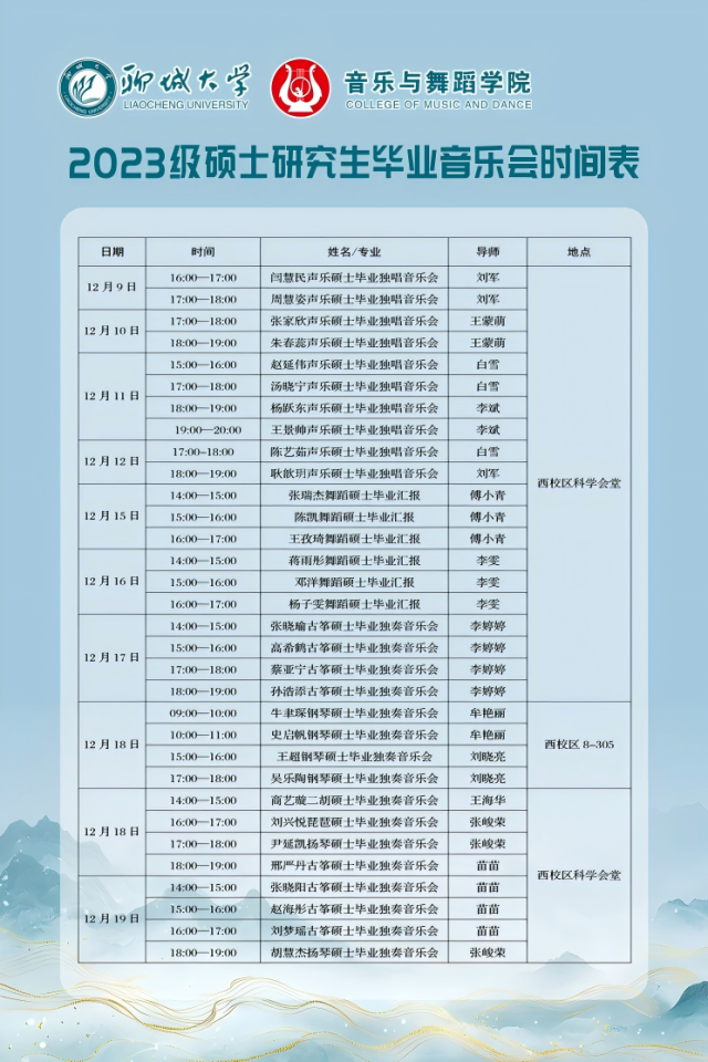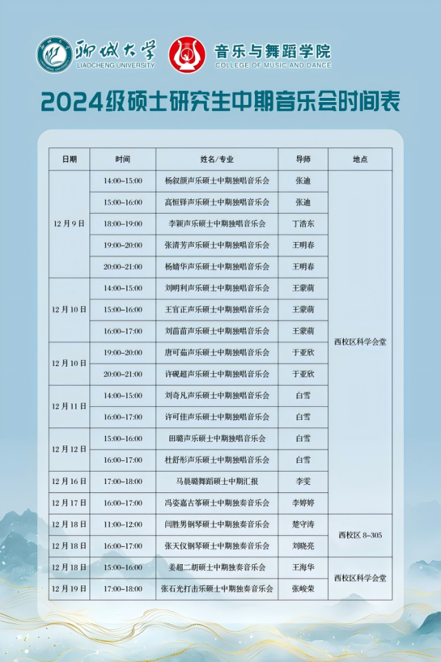为深入落实硕士研究生培养方案核心要求,扎实推进人才培养质量提升工程,12月9日至19日音乐与舞蹈学院将于在西校区科学会堂、8-305教室分场次有序举办2023级硕士研究生毕业音乐会及舞蹈毕业汇报与2024级硕士研究生中期音乐会及舞蹈中期汇报。