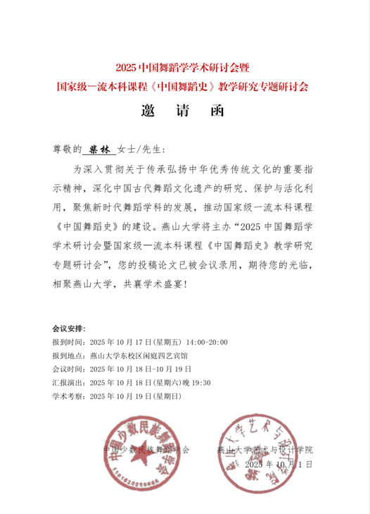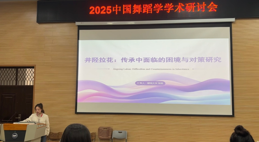 2025年10月18日,“活化古谱·赓续华章”2025中国舞蹈学学术研讨会暨国家级一流本科课程《中国舞蹈史》教学研究专题研讨会在燕山大学隆重举办。会议由中国少数民族舞蹈学会与燕山大学联合主办,聚焦古代舞谱活化、舞蹈课程教学转化及传统舞蹈传承创新等核心议题,吸引全国舞蹈学界专家学者、高校师生及非遗从业者齐聚交流。我院2025级研究生柴林(师从李雯副教授)携研究成果《井陉拉花:传承中面临的困境与对策研究》受邀参会。