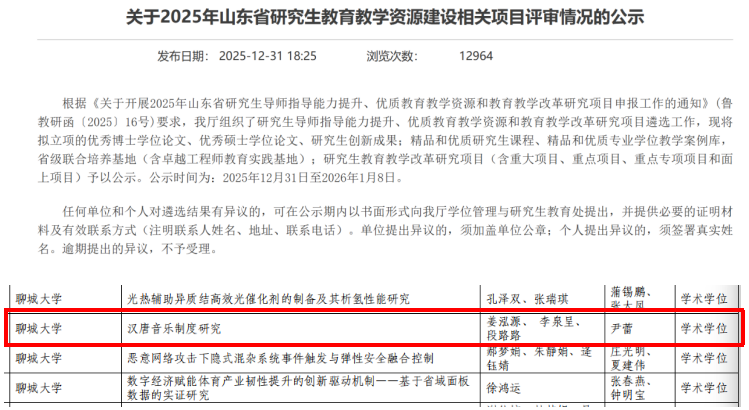 近日,山东省教育厅公布了2025年研究生创新成果获奖名单,我院研究生团队姜泓源、李泉呈、段路路(指导教师:尹蕾教授)申报的《汉唐音乐制度研究》成功入选。这也是我院首次获得此奖项,标志着我院硕士研究生培养质量的不断提升。