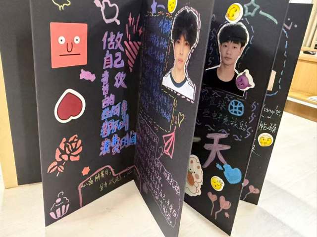 活动中,同学们跳出传统文字记录的框架,以黑卡为底、彩笔为锋,将职业期许与青春创意糅合进札记创作里。“海豹突击队”“欢乐斗地组”等充满趣味的小组名,彰显着音乐学子的团队协作意识;“希望未来像日出一样越来越好”“做自己喜欢的事,任何时刻都不算浪费时间”的暖心寄语,成为大家职业探索路上的精神锚点;舞台表演的瞬间定格、对音乐教育与演艺道路的畅想,都被精心贴进札记册中。一张张手绘卡片、一本本创意手账,不仅是个人职业思考的具象化表达,更成为班级同学间交流职业规划、分享专业心得的纽带。