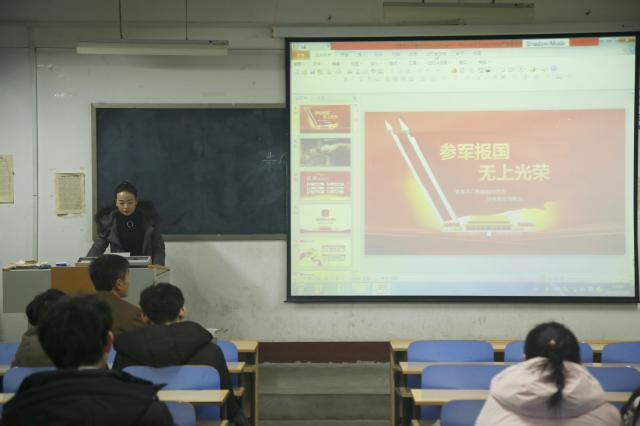 为做好2021年大学生应征入伍工作,2020年12月29日下午,音乐与舞蹈学院在308举行了“2021年征兵宣传大会”。此次宣讲会由音乐与舞蹈学院辅导员石晓晗担任主讲,党总支副书记、副院长张进军和有征兵意愿的同学参加了此次宣讲会。