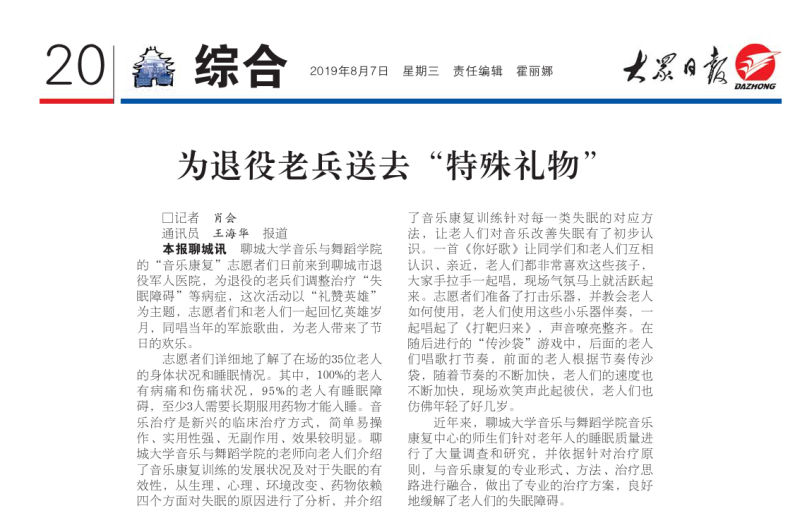 2019年8月7日《大众日报》以《为退役老兵送去特殊“礼物”》为题报道了音乐与舞蹈学院暑期社会实践活动。