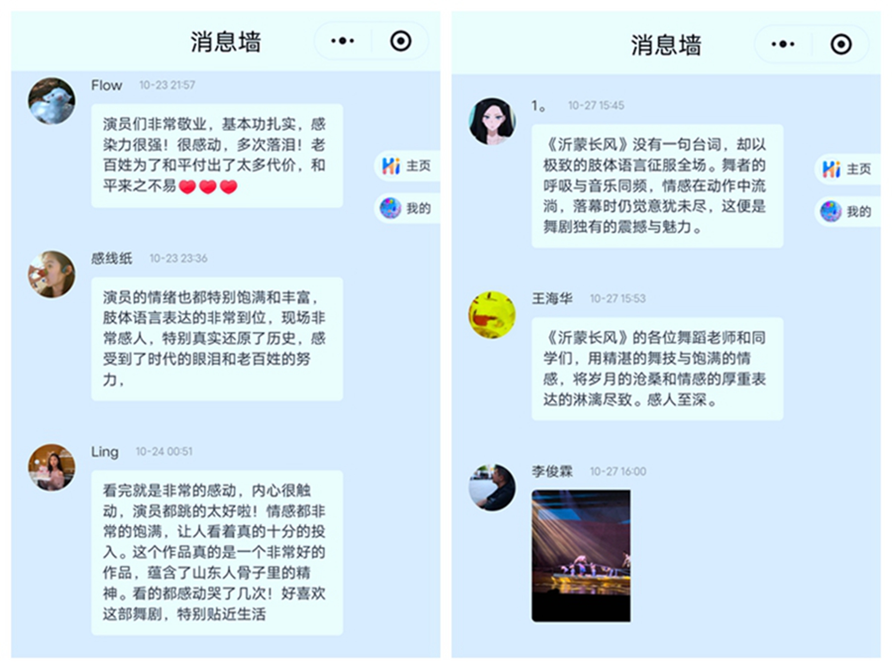 为进一步深化演出的育人价值,音乐与舞蹈学院以此次公演为契机,组织开展 “舞剧《沂蒙长风》观后感分享” 主题思想政治教育活动,引导师生从红色艺术中汲取精神力量,将沂蒙精神融入学习与工作中。有的评价分享道:“演员们非常敬业,基本功扎实,感染力很强!很感动,多次落泪!老百姓为了和平付出了太多代价,和平来之不易”“没有一句台词,却用极致的肢体语言征服全场,舞者的呼吸与音乐同频,情感在动作中流淌,落幕时仍觉意犹未尽,这就是舞剧独有的震撼与魅力”;还有的谈道:“演员情绪饱满,肢体语言到位,真实还原了历史,让我们看到了时代的眼泪与老百姓的努力”“作品里蕴含了山东人骨子里的精神,看的特别感动,哭了好几次”。