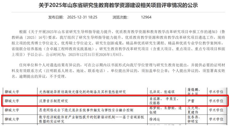 近日,山东省教育厅公布了2025年研究生创新成果获奖名单,我院研究生团队姜泓源、李泉呈、段路路(指导教师:尹蕾教授)申报的《汉唐音乐制度研究》成功入选。这也是我院首次获得此奖项,标志着我院硕士研究生培养质量的不断提升。
