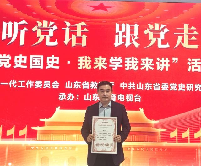 近日,由省关心下一代工作委员会、省教育厅、省委党史研究院、团省委联合举办的2025年“党史国史·我来学我来讲”活动获奖名单正式公布,我院党委副书记、副院长蘧广震的作品《歌舞颂经典 艺心永向党》从5000余件参赛作品中脱颖而出,获一等奖并受邀参加由山东教育电视台录制的展演和颁奖仪式。省关工委主任高新亭等相关领导出席并为获奖代表颁奖。