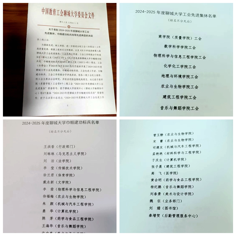 近日,学校公布2024—2025年度工会(妇委会)评优结果,音乐与舞蹈学院分工会工作成效显著,分工会获评“聊城大学工会先进集体”,王海华老师获评“聊城大学巾帼建功标兵”,杨纪鹏老师获评“聊城大学工会工作积极分子”。